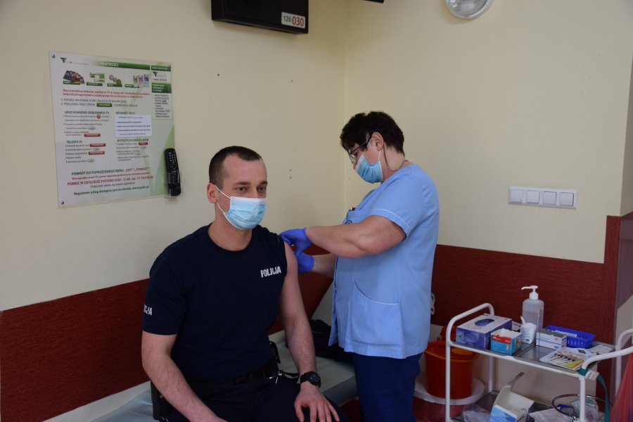 24 marca br., w szpitalu tymczasowym na PGE Narodowym odbyła się inauguracja akcji szczepienia służb mundurowych. Policjanci z garnizonu małopolskiego rozpoczęli szczepienia już 25 marca br. W szpitalu MSWiA w Krakowie, akcję zainaugurował, przyjmując pierwszą dawkę szczepionki, Zastępca Komendanta Wojewódzkiego Policji w Krakowie insp. Rafał Leśniak. Za jego przykładem, szczepionkę przyjęli kolejni policjanci. To funkcjonariusze pełniący funkcje w rożnych pionach i na różnych stanowiskach, w szczególności z tzw. pierwszej linii. W szpitalu przy ul. Galla szczepili się policjanci z komendy wojewódzkiej, miejskiej i powiatowej w Krakowie oraz z komend powiatowych z Miechowa, Proszowic i Wieliczki. Proces szczepień małopolskich policjantów odbywał się również w szpitalu w Nowym Targu, gdzie podano szczepionkę mundurowym z Myślenic, Nowego Targu, Suchej Beskidzkiej i Zakopanego. Natomiast, w szpitalu w Chrzanowie szczepili się policjanci z komend powiatowych z Olkusza, Chrzanowa, Oświęcimia i Wadowic. W kolejnych dniach, przyjęli szczepionkę także mundurowi z pozostałych jednostek garnizonu małopolskiego - w szpitalu w Tarnowie i Nowym Sączu. Szczepienia przebiegały bez przeszkód, szczepionki dotarły na czas a funkcjonariuszom wyznaczono już termin szczepień drugą dawką.