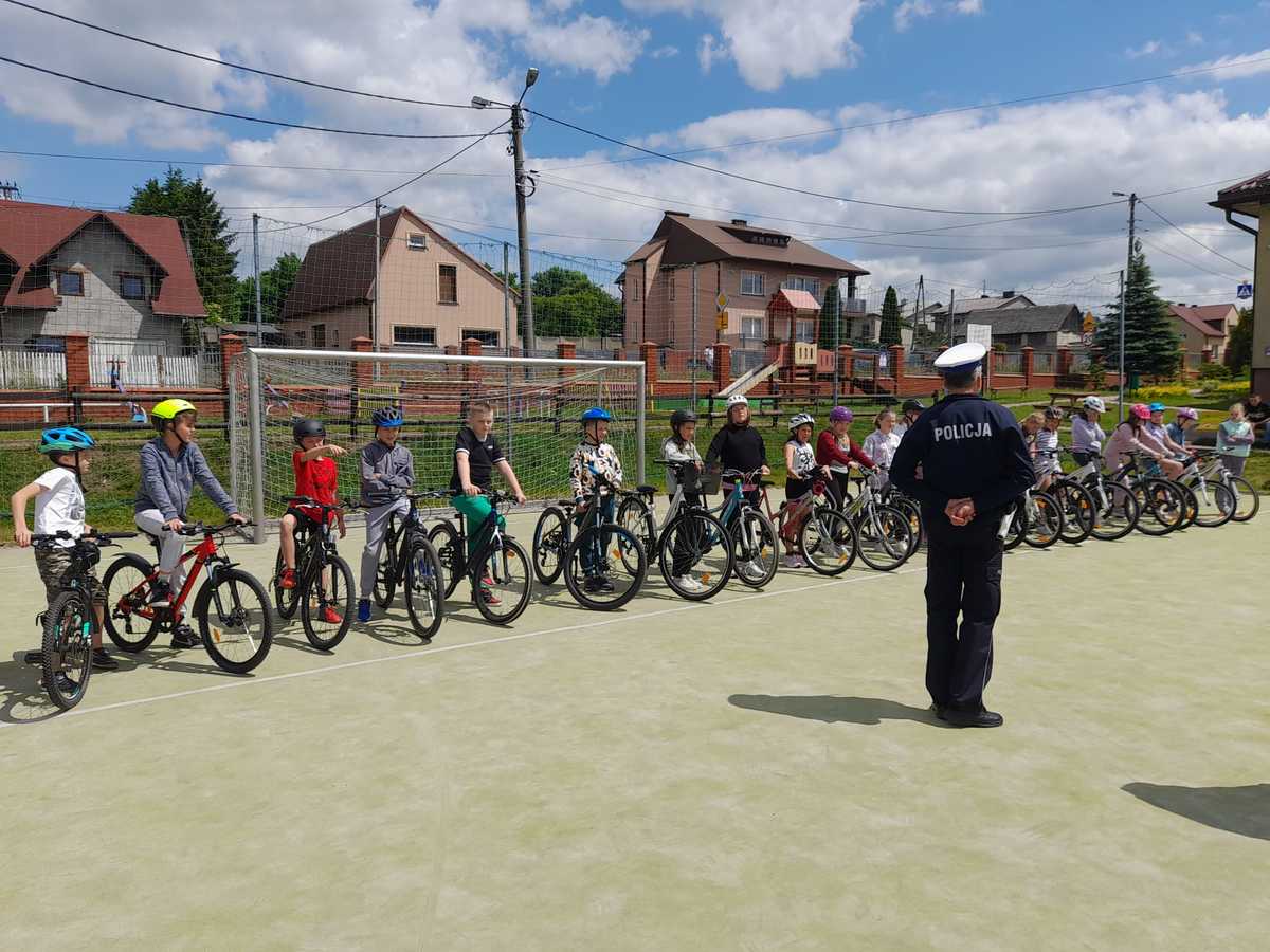 Policjanci edukują uczniów z zakresu bezpieczeństwa podczas egzaminu na kartę rowerową w Szkole Podstawowej w Kwaśniowie – „Jednośladem bezpiecznie do celu”