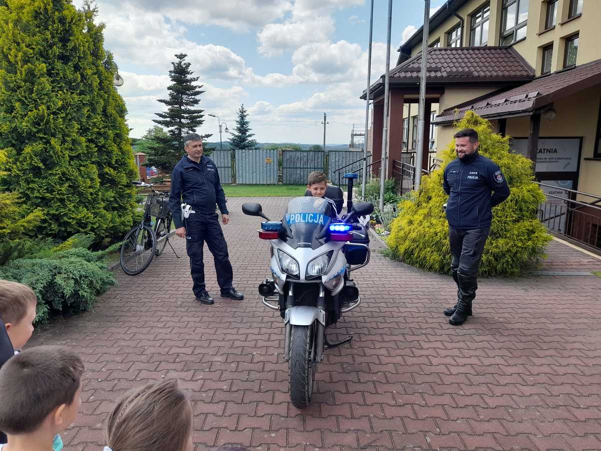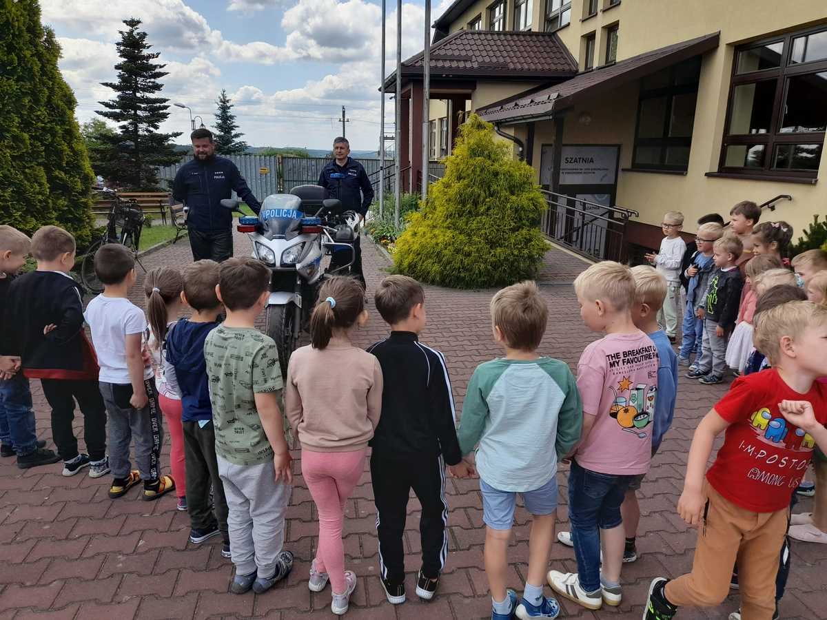 Korzystając przyjazdu policjantów, przedszkolaki z tej szkoły ruszyły na spotkanie z mundurowymi. Dzieci zachwycone widokiem policjantów, chętnie wsiadały na policyjny motocykl i pozowały do pamiątkowych zdjęć. To spotkanie z maluchami było również okazją by przypomnieć im podstawowe zasady bezpieczeństwa w ruchu drogowym jakie obowiązują pieszych.