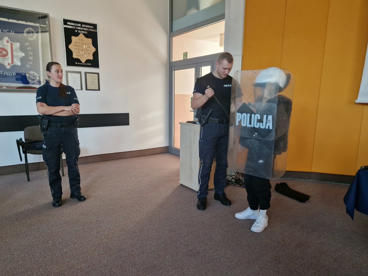Policjantka zajmująca się prewencją po krótce opowiedziała o historii Polskiej Policji, organizacji i zadaniach mundurowych. Wyjaśniała, młodym ludziom jakie kryteria i wymogi musi spełniać kandydat do służby. Informowała o procesie kształcenia i dalszych etapach postępowania, zachęcając młodzież do wstąpienia w szeregi. Wizyta dzieci i młodzieży połączona była również ze zwiedzaniem budynku Komendy Powiatowej Policji w Olkuszu. Uczniowie mieli okazję zwiedzić recepcję, areszty oraz niebieski pokój.