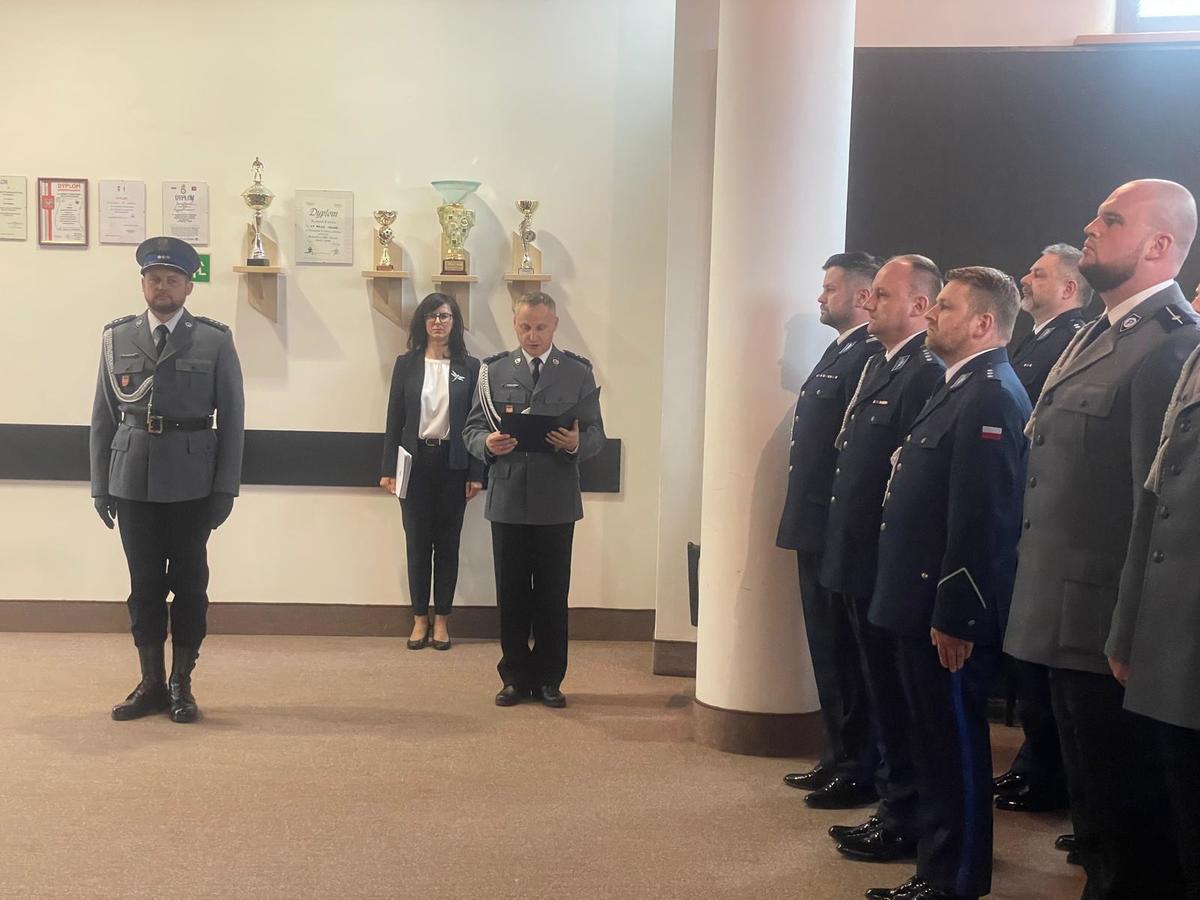 W uroczystości udział wzięli Komendant Powiatowy Policji w Olkuszu młodszy inspektor Dominik Jurczak, I Zastępca Komendanta Powiatowego Policji w Olkuszu komisarz Tomasz Mosur oraz kadra kierownicza tutejszej jednostki i podległych komisariatów. Uroczystość rozpoczęła się meldunkiem jaki dowódca uroczystości komisarz Marcin Kwiecień złożył Komendantowi Powiatowemu Policji w Olkuszu. Następnie wprowadzono sztandar Komendy Powiatowej Policji w Olkuszu. Kolejnym punktem ceremonii było wręczenie aktów mianowania na wyższe stopnie policyjne 8 policjantom a wśród nich było 2 aspirantów, 5 podoficerów i 1 posterunkowy.