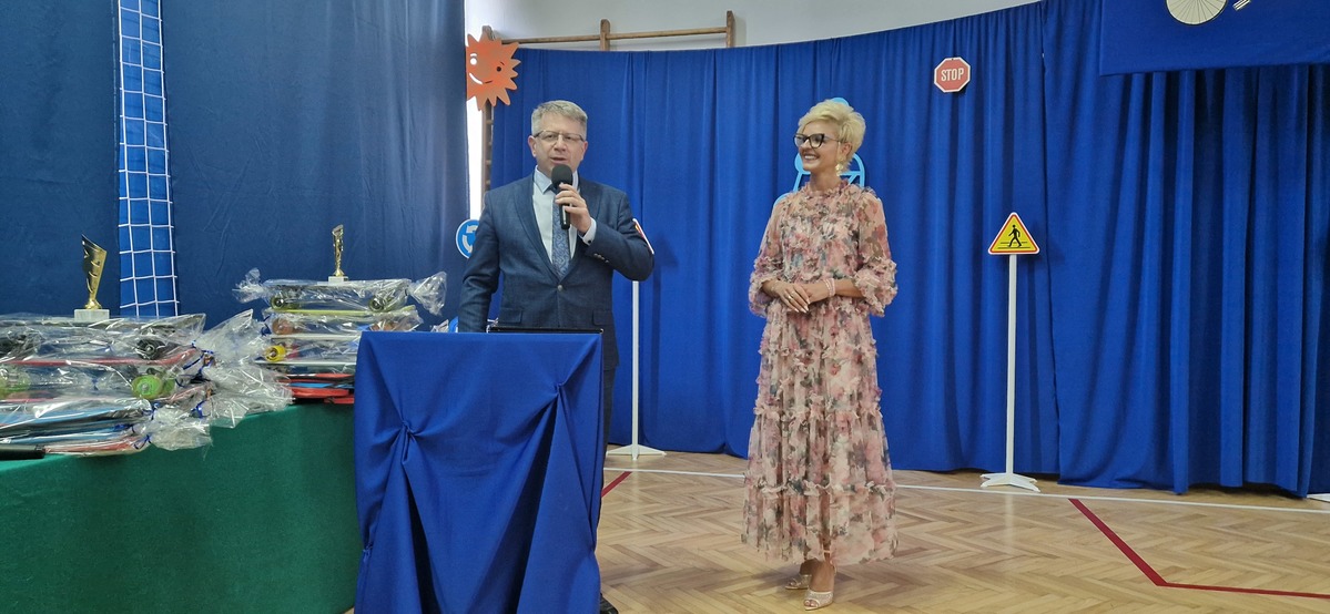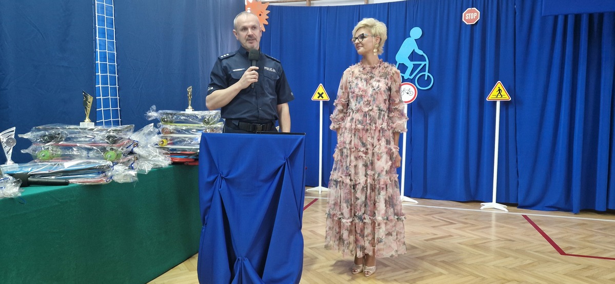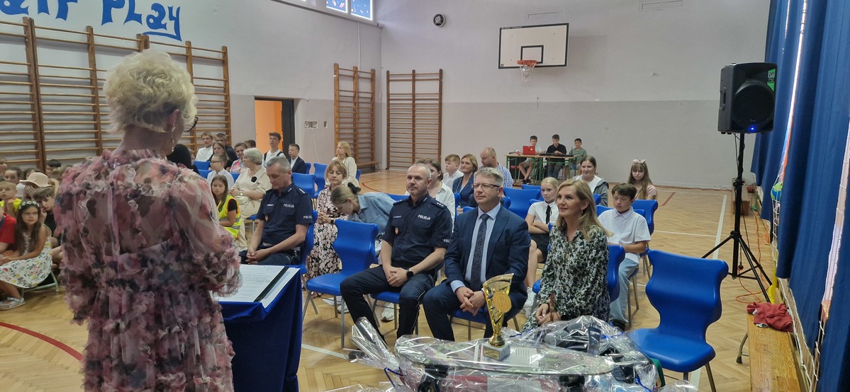 Uroczyste wręczenie odbyło się na sali gimnastycznej, gdzie zgromadzili się zwycięscy konkursu ich opiekunowie, dyrekcja i grono pedagogiczne, uczniowie szkoły a także zaproszeni goście m.in. Wiceburmistrz Marcin Wiercioch, I Zastępca Komendanta Powiatowego Policji w Olkuszu kom. Tomasz Mosur, Specjalista Wydziału Ruchu Drogowego asp. szt. Sebastian Sarecki oraz Oficer prasowy kom. Katarzyna Matras. Otwarcia uroczystości dokonała Pani Dyrektor Justyna Banyś-Przybylska, która podziękowała wszystkim uczestnikom, uczniom oraz nauczycielom za udział w Turnieju Bezpieczeństwa w Ruchu Drogowym. Następnie głos zabrał I Zastępca Komendanta Powiatowego Policji w Olkuszu i Wiceburmistrz Miasta i Gminy Olkusz Marcin Wiercioch. W swoim przemówieniach rozmówcy podkreślali, że edukacja w zakresie bezpieczeństwa w ruchu drogowym jest niezwykle ważna i należy ją piastować na każdym etapie rozwoju dzieci i młodzieży.