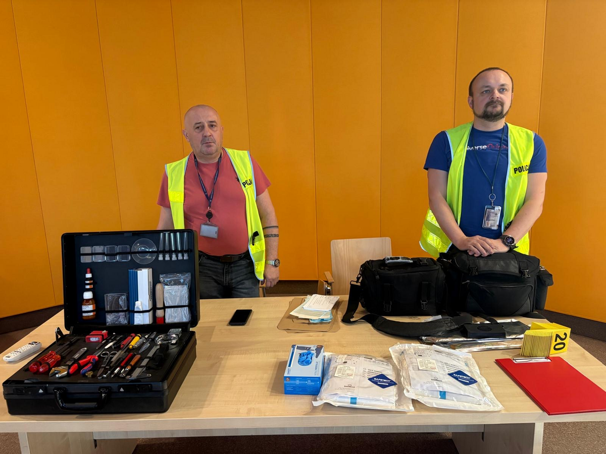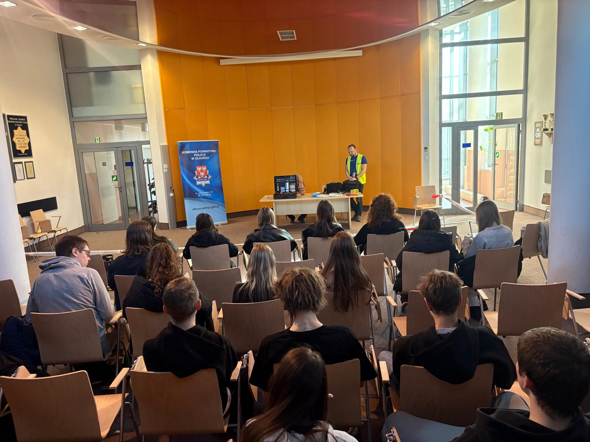 Wizyta rozpoczęła się od zajęć z technikami kryminalistyki na auli, gdzie uczniowie mogli z bliska przyjrzeć się narzędziom wykorzystywanym w codziennej służbie. Funkcjonariusze szczegółowo omówili specyfikę swojej pracy, podkreślając, że to właśnie od ich skrupulatności na miejscu zdarzenia zależy często zebranie kluczowych dowodów.