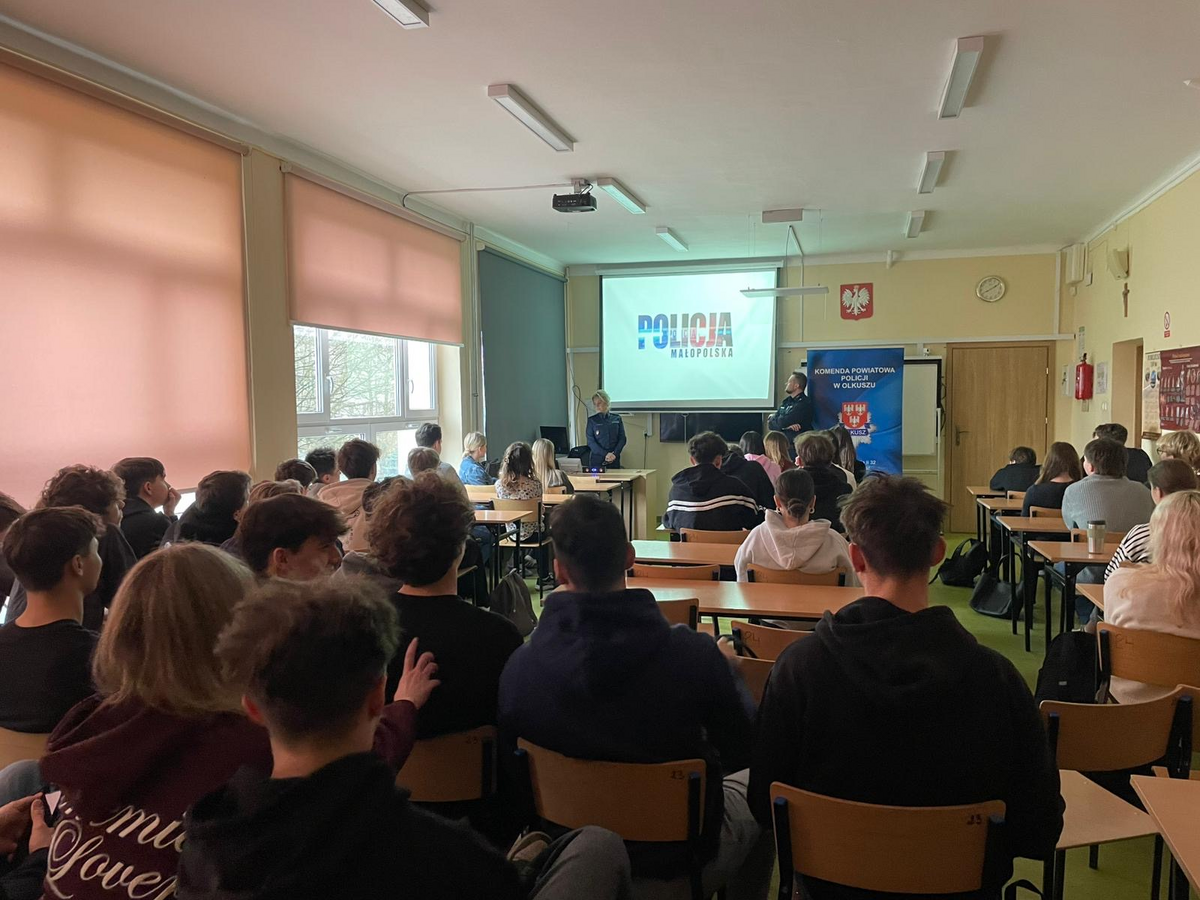 Ostatnie dni marca były dla funkcjonariuszy z Komendy Powiatowej Policji w Olkuszu oraz Komisariatu w Wolbromiu czasem intensywnych rozmów o przyszłości zawodowej młodzieży. Po wizycie w Zespole Szkół w Wolbromiu, które miało miejsce 26 marca 2026 roku, finałowe spotkania miały miejsce w I Liceum Ogólnokształcącym im. K. K. Wielkiego w Olkuszu. To właśnie tam, 27 marca oraz dzisiaj, 30 marca, mundurowi oficjalnie podsumowali i zakończyli akcję promocyjną w bieżącym roku szkolnym.